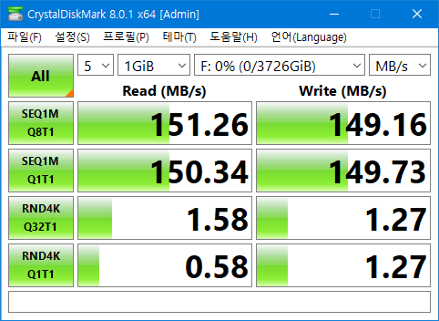 읽기/쓰기 속도는 모두 약 150MB/s. 5900RPM에 USB 연결로 이정도면 아직은 쓸만하다.