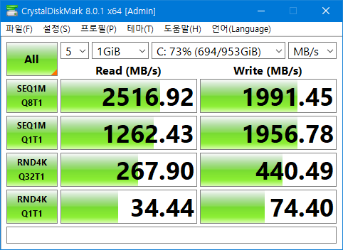 사양엔 읽기 3500MB/s, 쓰기 3000MB/s로 되어있다.