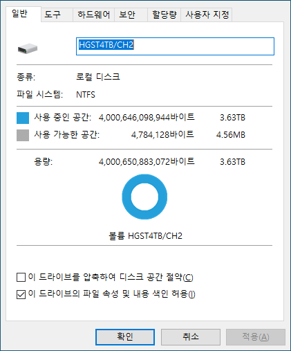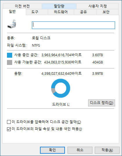 VHD 용량은 4,398,027,632,640 바이트로 남은 공간이 404GB 남았지만 물리적, 논리적으로 사용할 수 없는 영역이다.