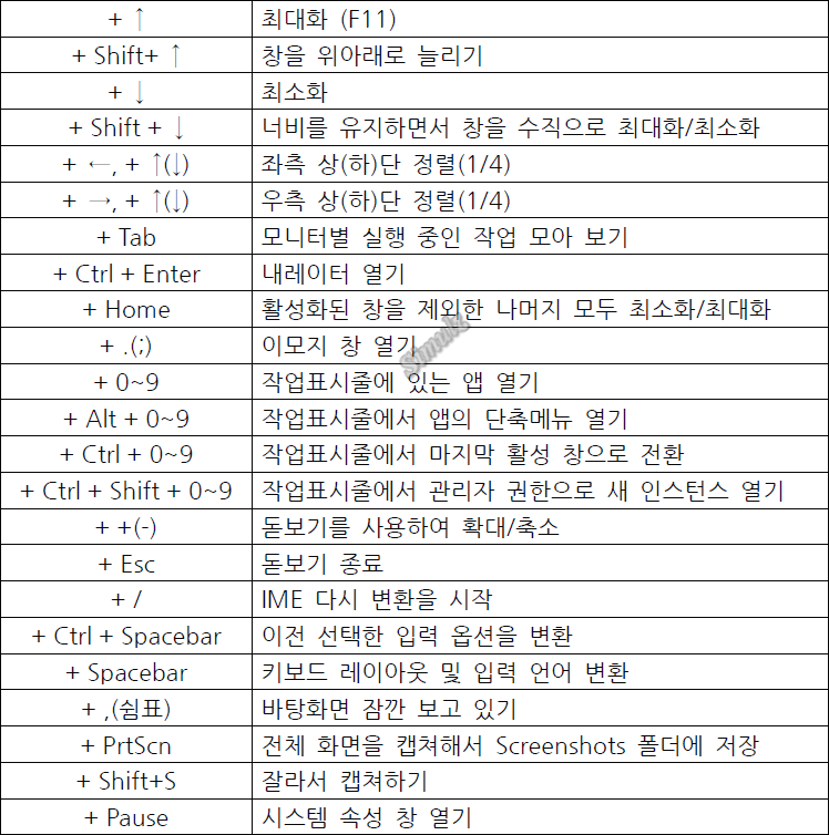 윈도우 10용 단축키입니다. 윈도우 11에서도 단축키는 같지만, 실행되는 프로그램은 다를 수 있습니다.