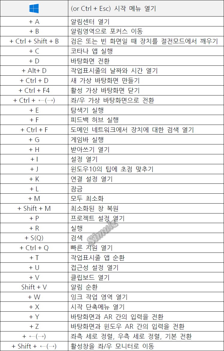 윈도우 10용 단축키입니다. 윈도우 11에서도 단축키는 같지만, 실행되는 프로그램은 다를 수 있습니다.