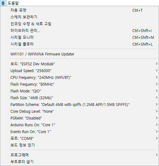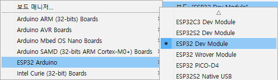 보드 설정에서 ESP32 Dev Module을 선택한 후,