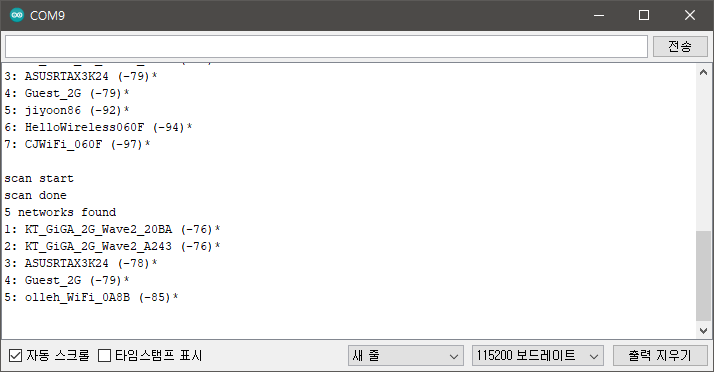 툴 - 시리얼 모니터에서 속도를 115200 보드레이트로 선택하면 아래처럼 통신이 된다.