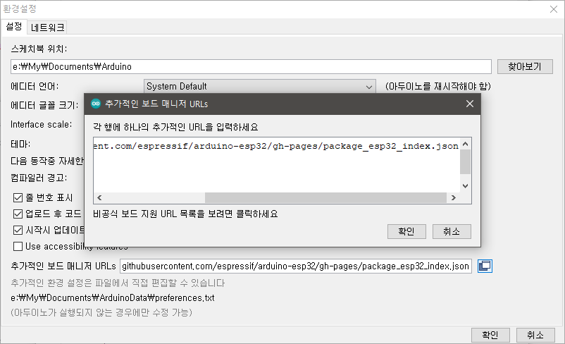 아두이노 환경설정에서 추가적인 보드 매니저 URLs에 아래 경로를 추가한다.