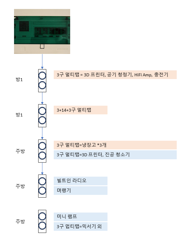 (예: 전열기기 차단기 3개일 때, 차단기1→방1→화장실 콘센트 / 차단기2→방2→부엌 콘센트 / 차단기3→거실→베란다 콘센트) - 사용하려는 기기의 정격 및 실제 소비전력을 확인할 것.