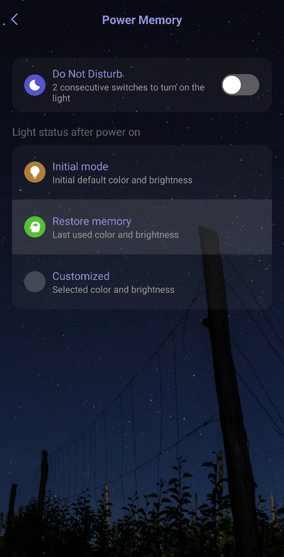 스마트 전구 화면에서 우측 하단의 More 버튼을 누르면 동작 설정 메뉴가 나타난다.