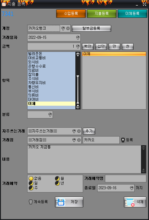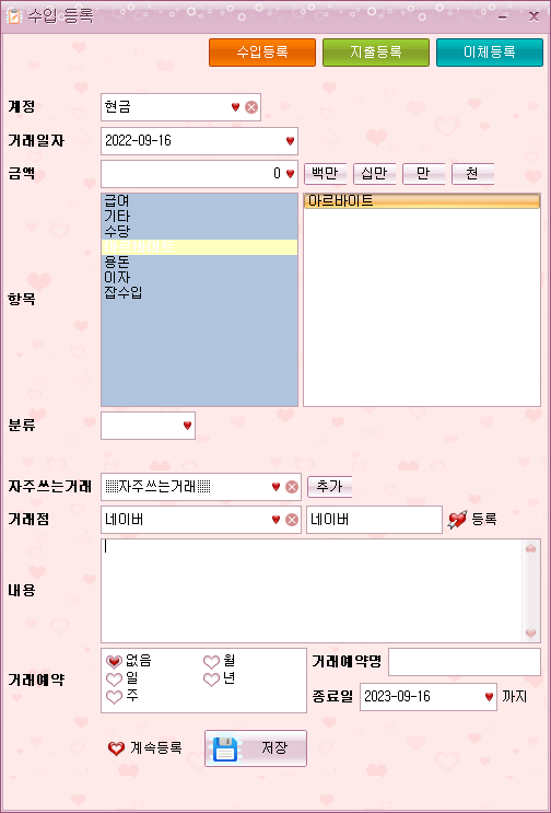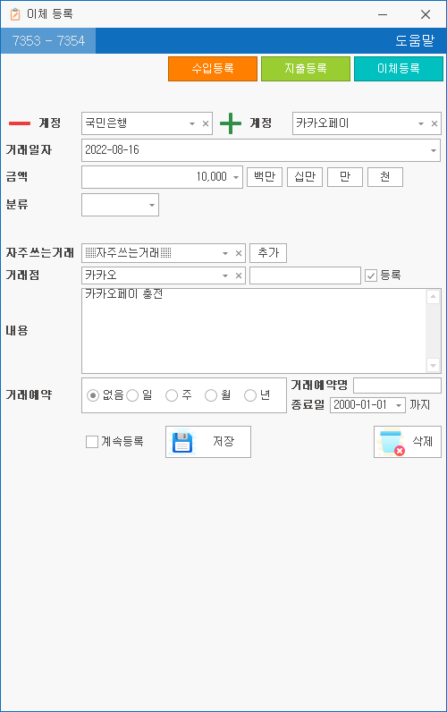 거래 등록 시, 계속 거래 기능 완료: 거래 등록 창이 닫히지 않고 내용이 남아 있는 기능.