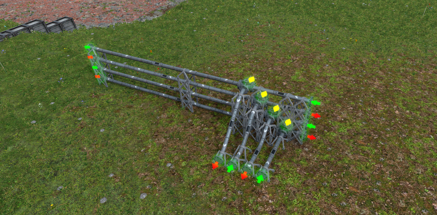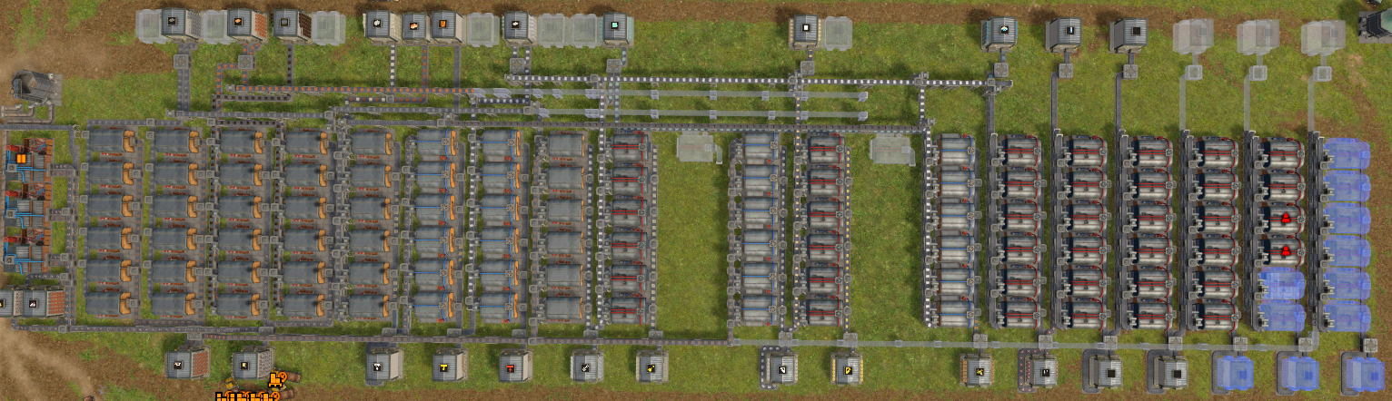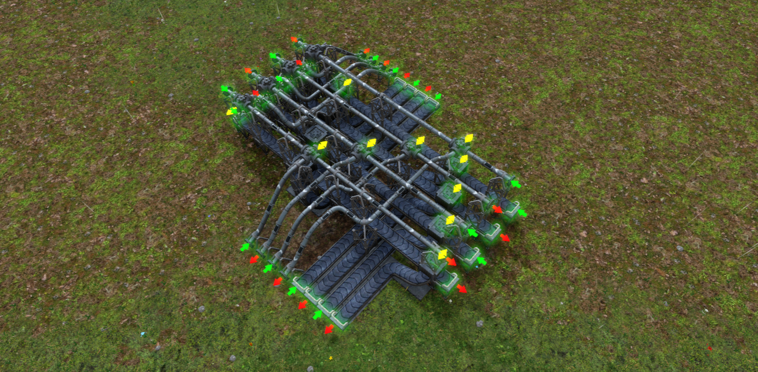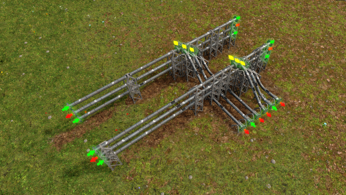 상하층으로 나눠서 배치한 모습이다. 최대 14종의 물류를 이송할 수 있다(건널목 때문). 각 이송 라인은 1셀씩 띄워야 교차 연결이 가능하다. (1, 3)층, (1, 4)층, (2, 3)층, (2, 4)층을 사용하면 된다.