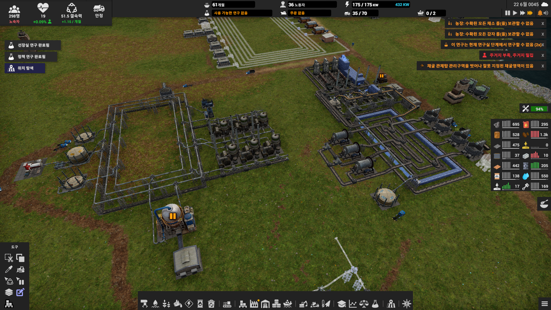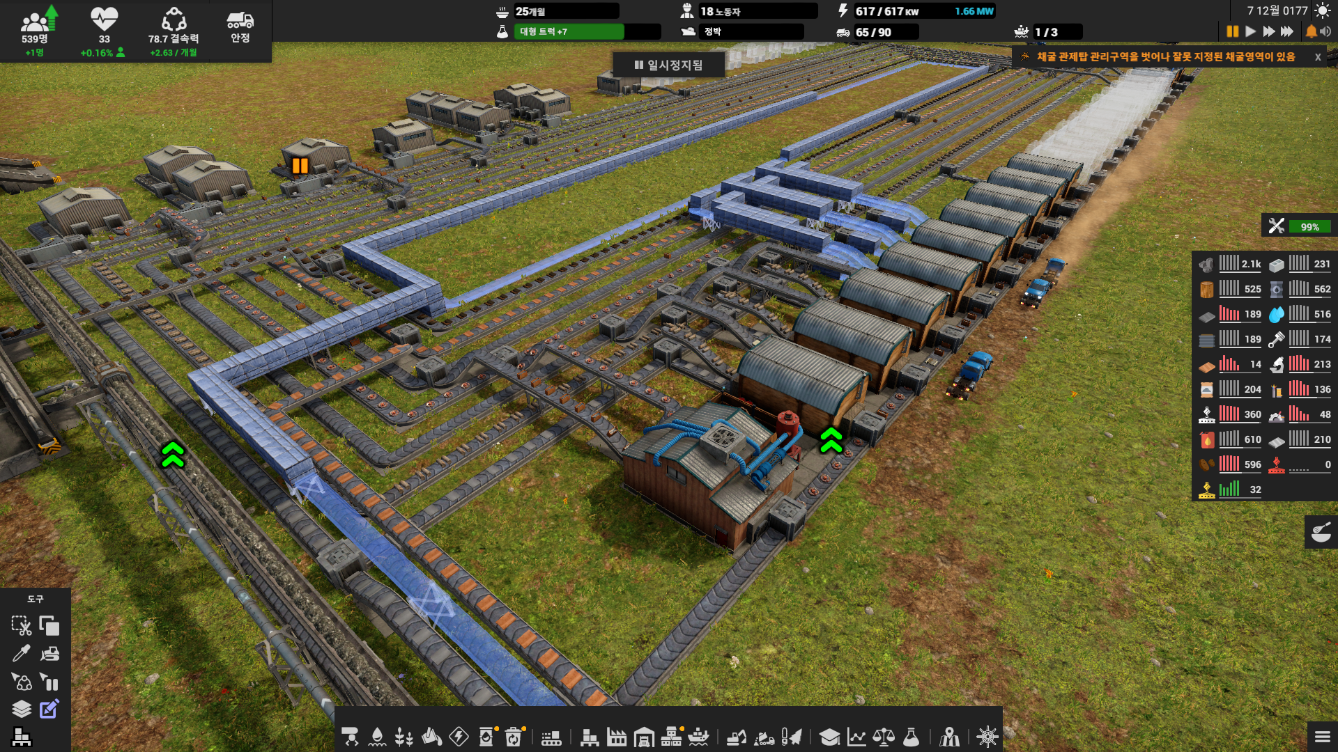 컨베이어와 파이프를 배치할 때는 충분한 공간을 확보하고 일관성 있는 모양이 나오도록 하는 것이 좋다. 그래야 건물과 물류 라인의 확장이 용이하다.