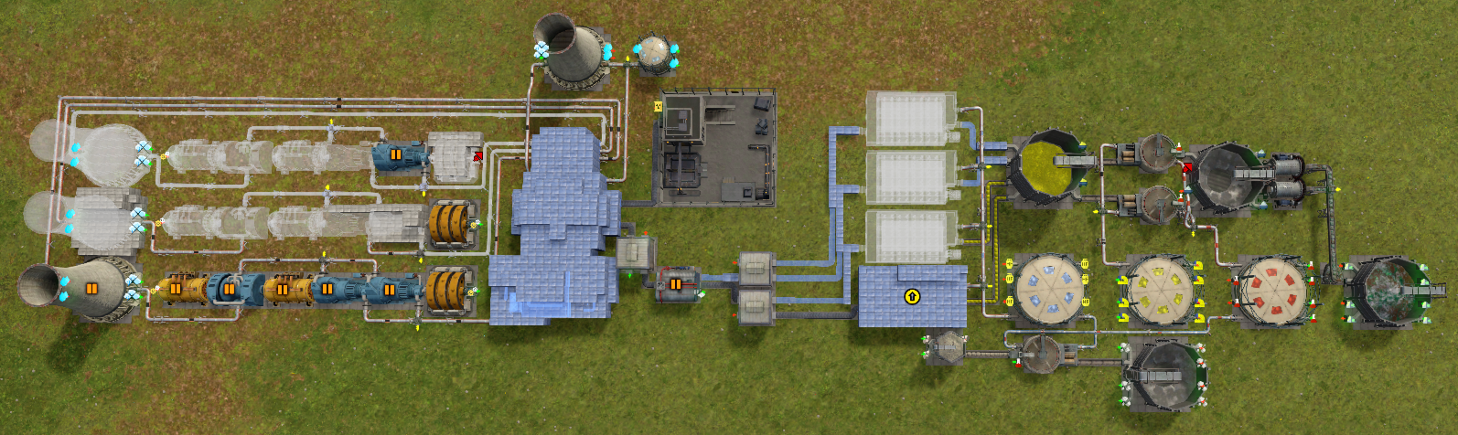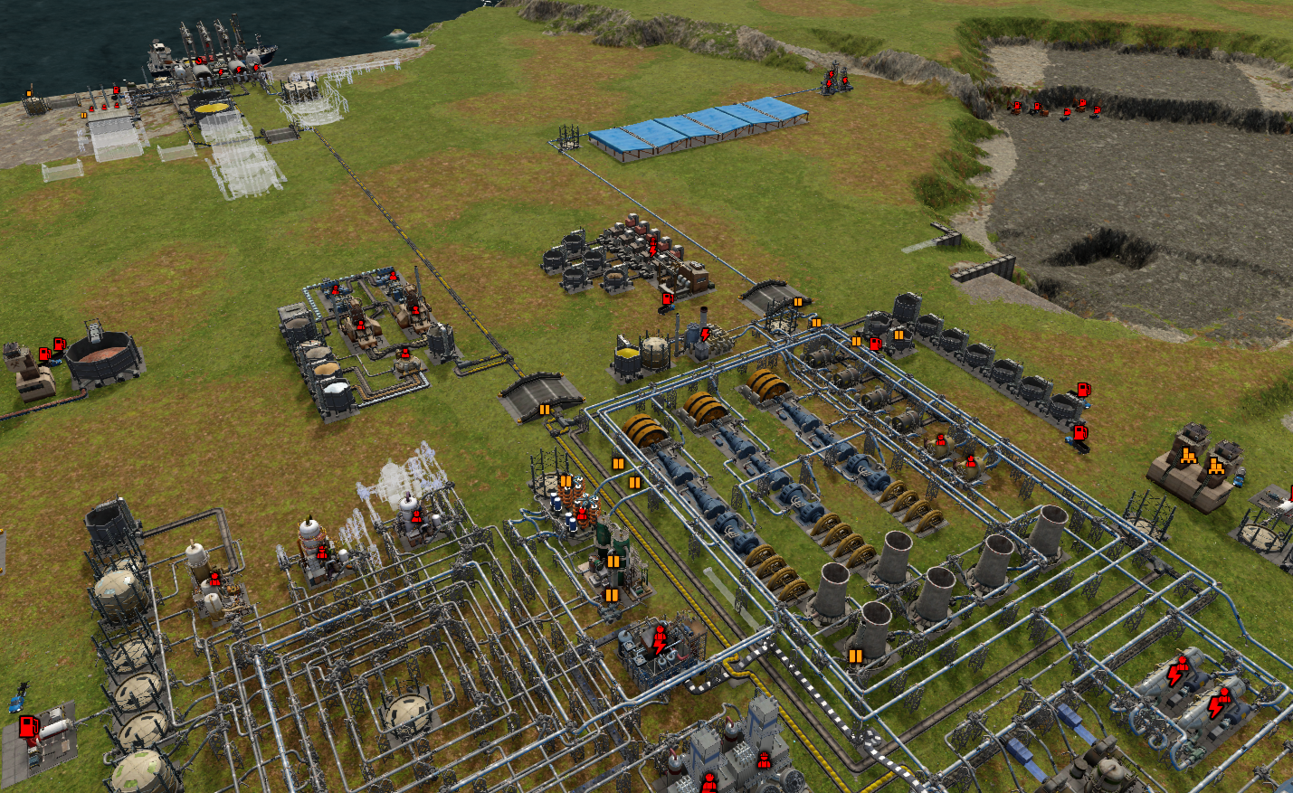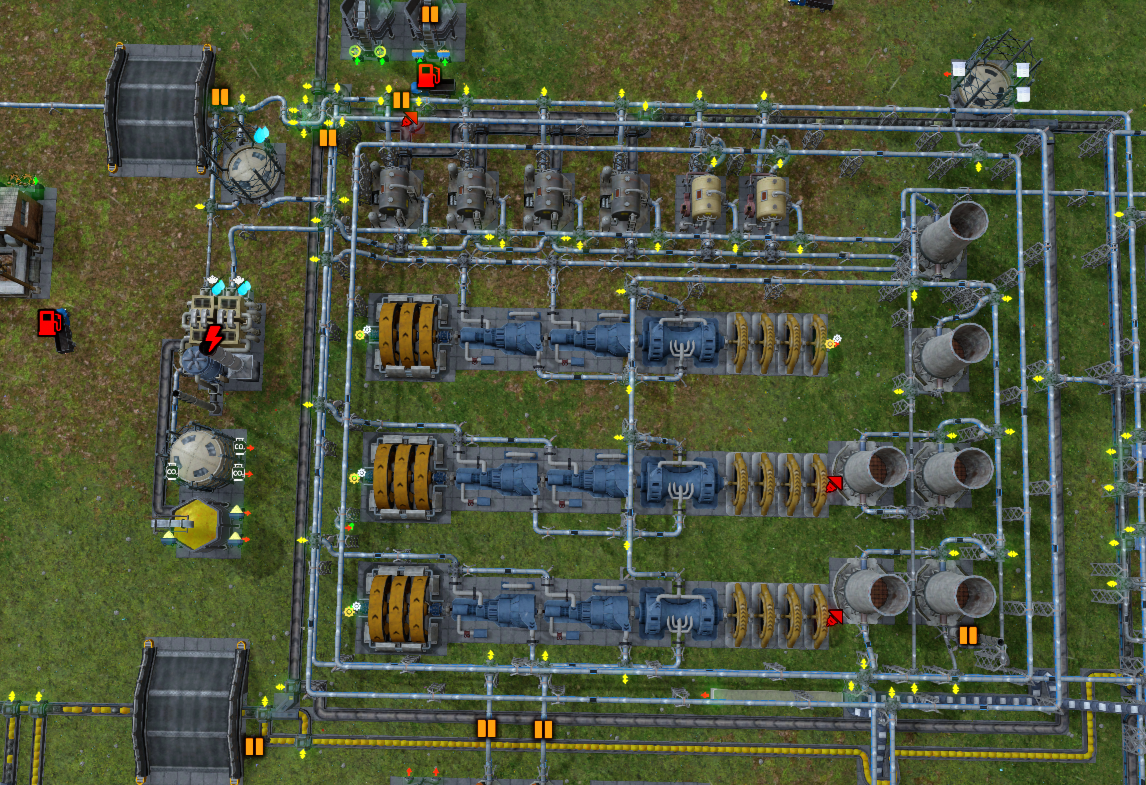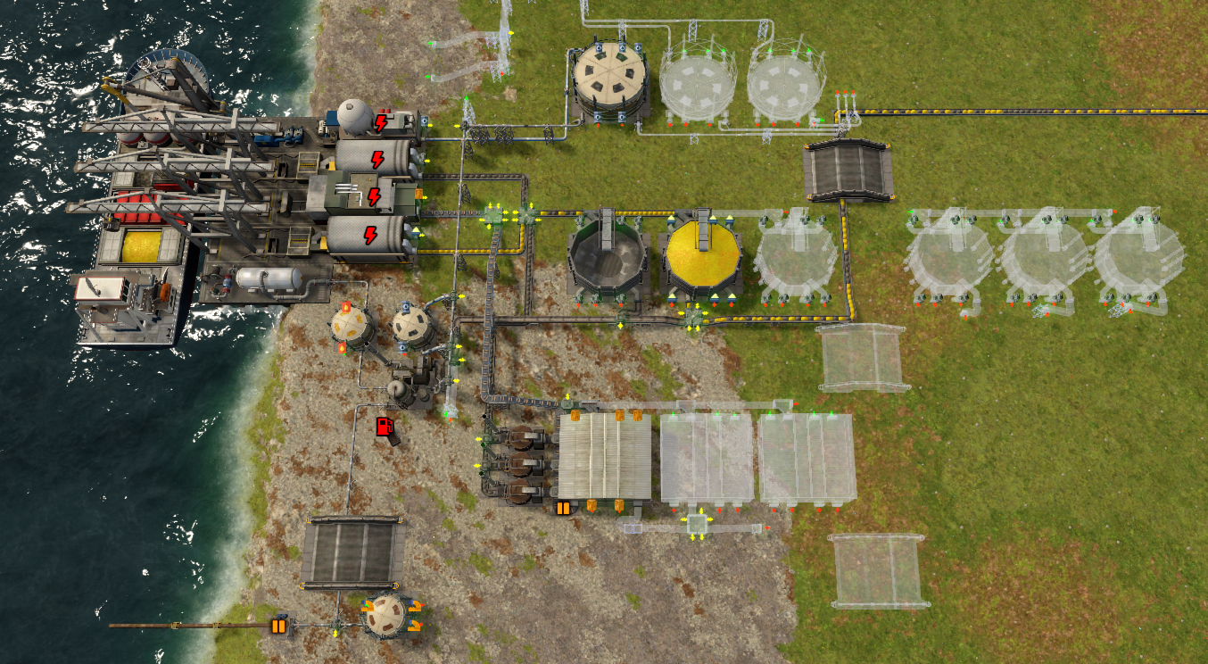 기본 증류기의 원유는 54개/분만큼 필요로 하기 때문에 트럭 배송을 하지 말고 파이프로 연결한다. 석탄은 6개/분을 필요로 하므로 트럭 배송을 해도 된다.