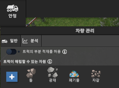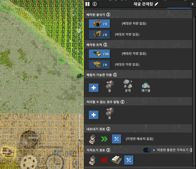 위 그림처럼 매립할 지역 근처에 채굴 관제탑을 만들고 매립지역을 지정하면 된다. 매립용 관제탑에는 차량을 지정할 필요가 없다. 배차된 굴삭기나 트럭은 채굴용이다. 그리고 매립을 허용할 자원을 설정해 주면 그 자원만 매립이 된다. 돌, 자갈, 모래, 흙 등 자원별로 각 지역을 정해서 매립해 두면 나중에 필요할 때마다 채굴하면 훨씬 빠르게 공급된다.