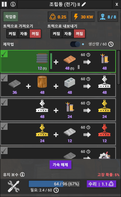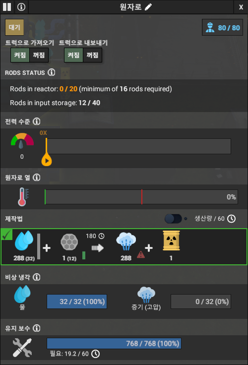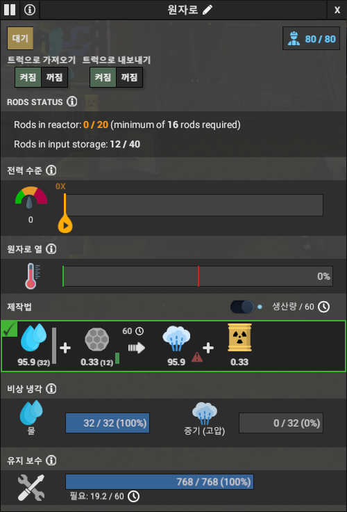 60초당 생산량이 나와있는데, 우라늄 원료봉이 60초당 0.33개 소비한다고 나타난다. 생산량/60 토글을 켜면 시간당 생산량이고, 끄면 1사이클 생산량이다. 즉, 180초 동안 288개의 물과 1개의 우라늄 원료봉이 필요하다. 가능한 원자로가 꺼지지 않도록 관리해야 전력 관리가 된다.
