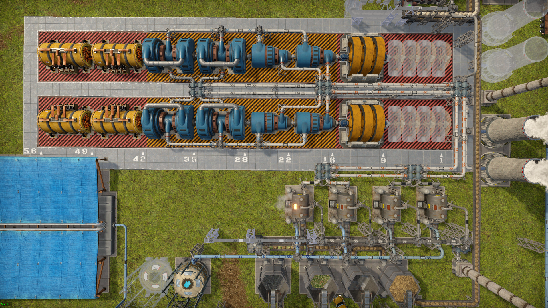 발전 설비 전체가 차지하는 영역은 7*55칸이다. 대형 발전기를 설치하면 발전기 4개는 철거하므로 맨 뒤의 5*8 영역이 확보된다. 확보된 영역에 플라이휠을 추가로 설치할 수 있다.