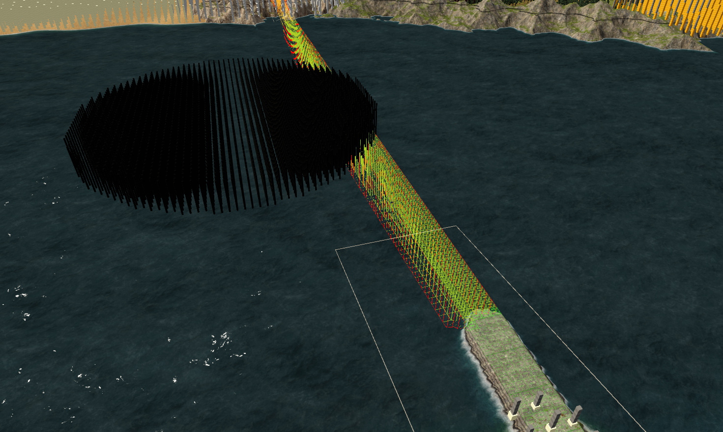 아래 그림의 맵은 C형태의 맵인데 평지가 매우 넓다. C 양쪽 끝을 매립해서 O로 만드는 것이 자율 목표인 맵이다. 그 이유는 C 끝점 사이에 대형 원유 매립지(>1.1M)가 있기 때문. 그리고 멀리 있는 끝점에 금광(>1.2M)이 있다.
