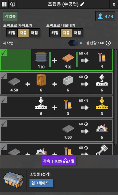 이후에는 원재료와 생산품의 수량을 확인해야 한다. 차량의 적재물 제한이 있기 때문에 입출력 양이 많은 품목은 컨베이어와 파이프로 연결한다.
