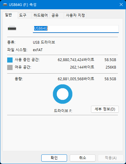 58.5GiB로 표시된다. (도대체 왜 윈도우는 GB를 GiB로 표시 안 해서 논란을 만드는지 참...)