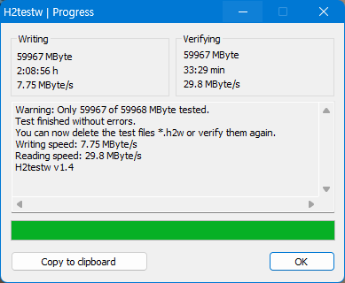 2시간 이상 59967MByte 전부 기록이 완료 됐다. 30분 이상 검증까지 완료했다.