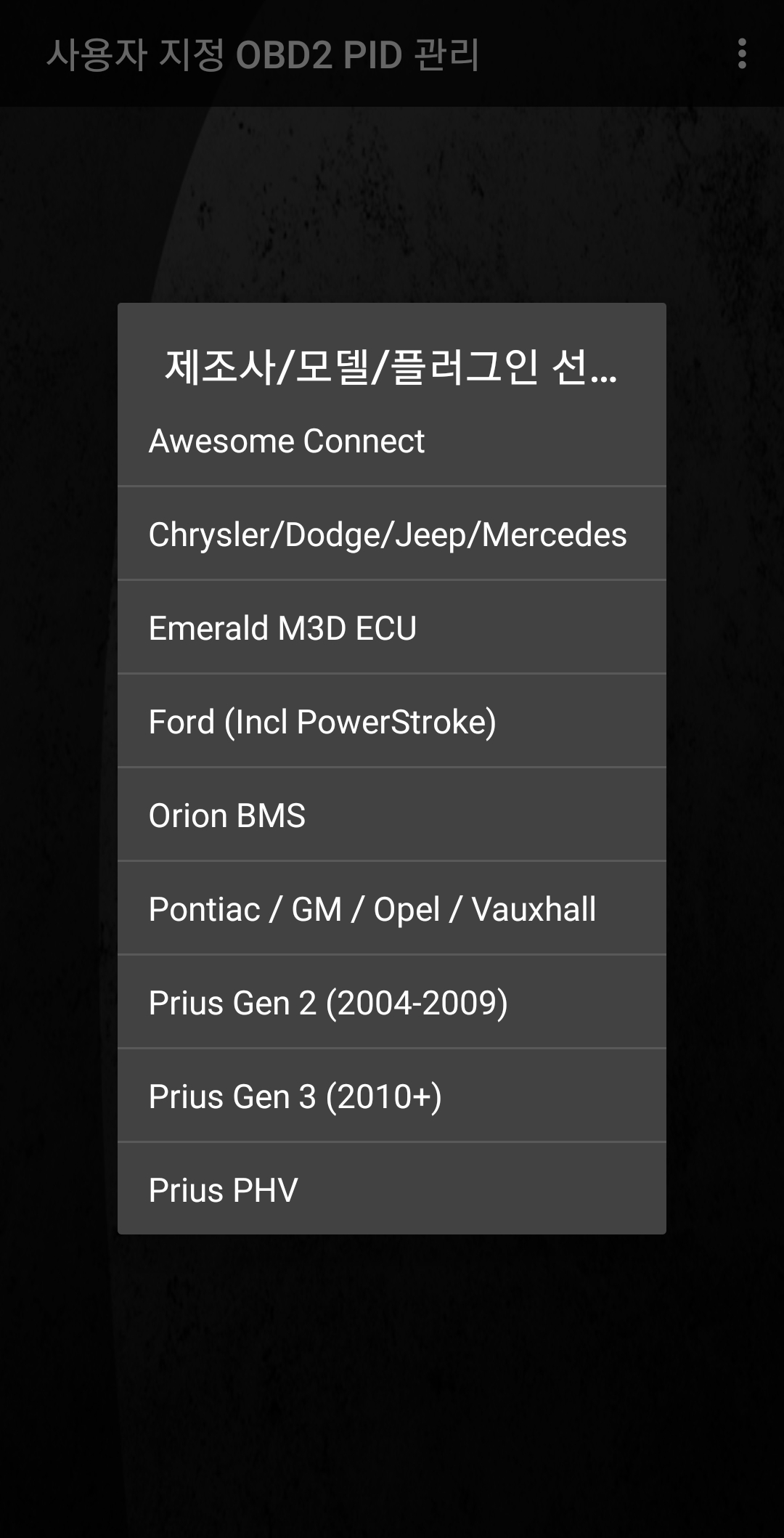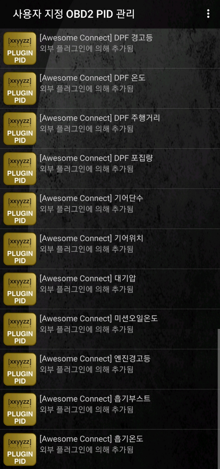 사용하면서 토크 어플만 직접 실행하는 경우가 있습니다. 어썸커넥트를 통해 실행된 것이 아니면 확장 PID에 등록된 플러그인이 삭제되며 DPF 등의 추가 정보 통신이 되지 않게 됩니다. 이때에는 확장 PID/센서 관리 화면에서 다시 등록해야 합니다. 토크를 재실행하는 경우에도 어썸커넥트를 통해 실행하는 것이 좋습니다.