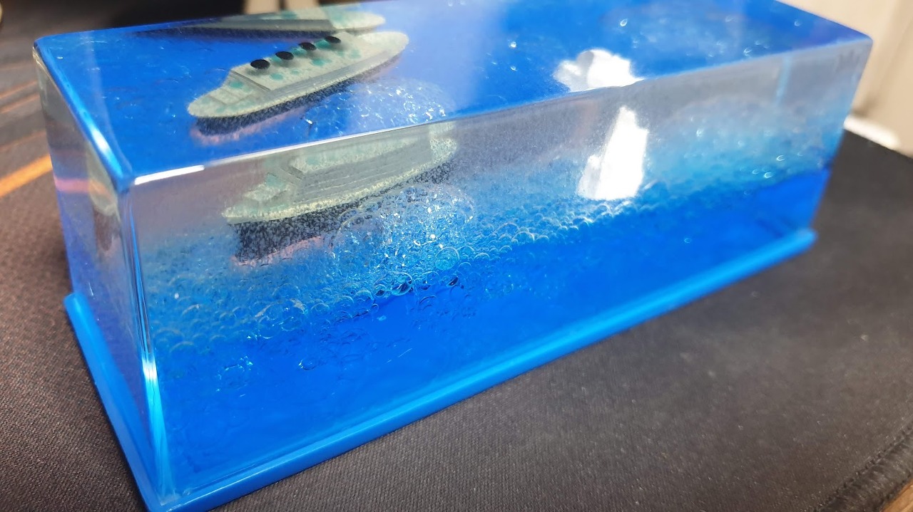 제조 공정은 아마도...투명 용기에 장식품을 넣고 커버를 닫고 밀봉을 한 다음, 주입구로 기름을 일정량 넣고, 염색된 물을 채우고 구멍을 막는 것 같다.