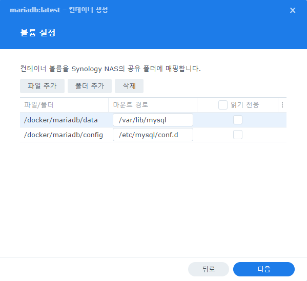 폴더 추가하기로 /docker 아래에 위와 같은 폴더를 추가하고 마운트 경로를 입력.