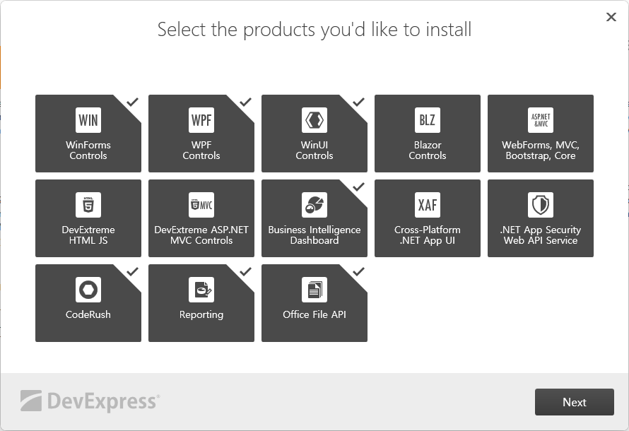 DevExpress 설치 후, Visual Studio 2022를 처음 실행할 때는 IDE 화면에서 멈춰버린 것처럼 보이지만 끝까지 기다리면 실행이 완료 된다. DE와 VS가 짝짜꿍할 시간이 필요한 것이다. 이 후 실행부터는 정상 동작한다.