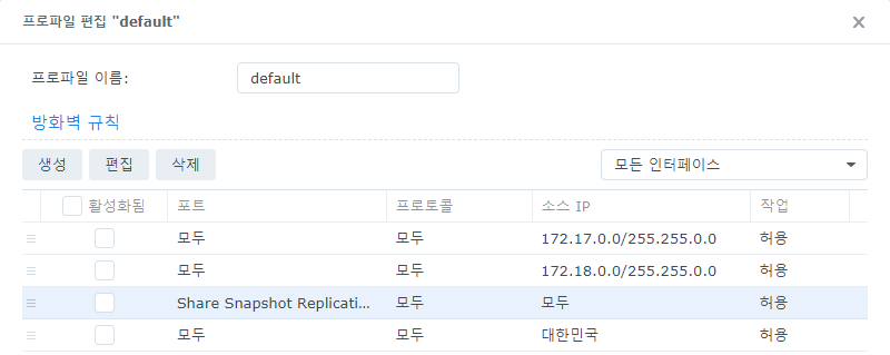 ⬇️프로토콜 모두, 소스 IP 모두, 작업 허용인 항목을 찾아서 편집 버튼을 누릅니다.