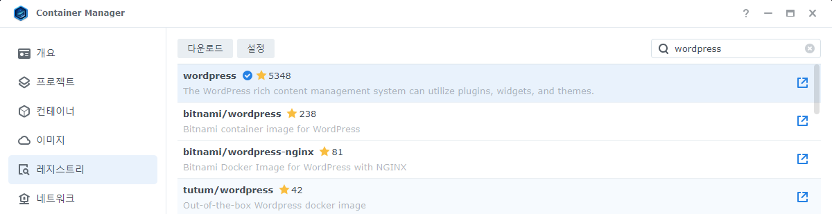 레지스트리 탭에서 wordpress를 검색하면 여러 개가 검색됩니다.