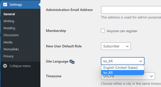 Settings - General - Site Language를 ko_KR로 변경합니다.