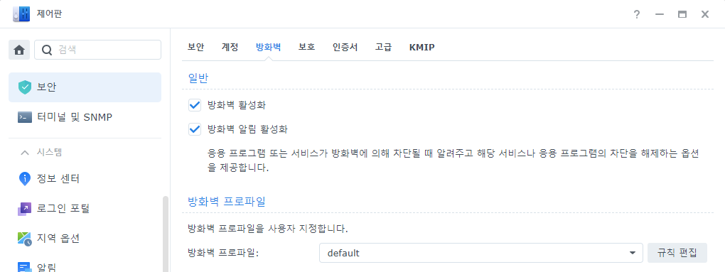 ⬇️제어판 - 보안 - 방화벽으로 이동 후, 방화벽 프로파일의 규칙 편집 버튼을 누릅니다.