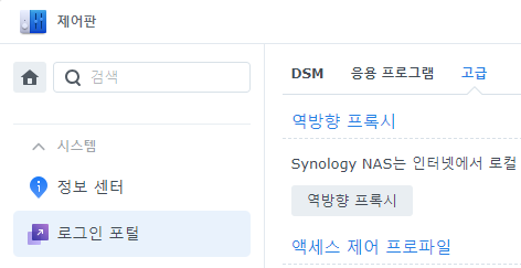 NAS 제어판 - 로그인 포털 - 고급 - 역방향 프록시 버튼을 누릅니다.