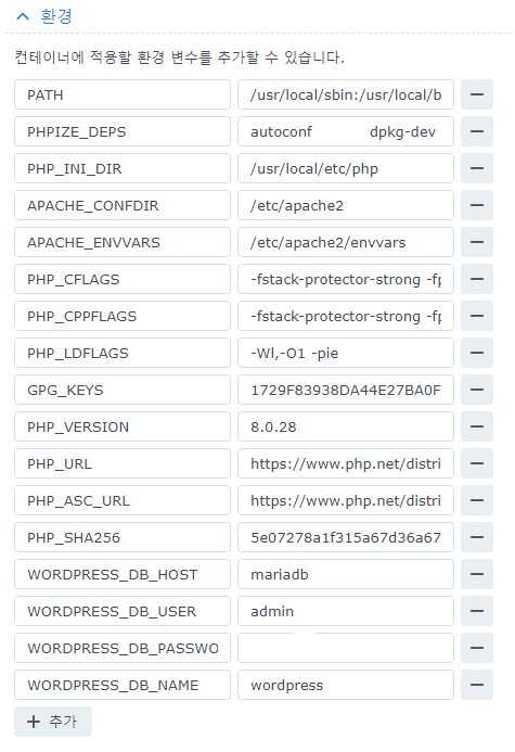 WORDPRESS_DB_HOST 항목에 DB 컨테이너 별칭을 입력합니다. 별칭은 링크 항목에서 설정한 값입니다.
