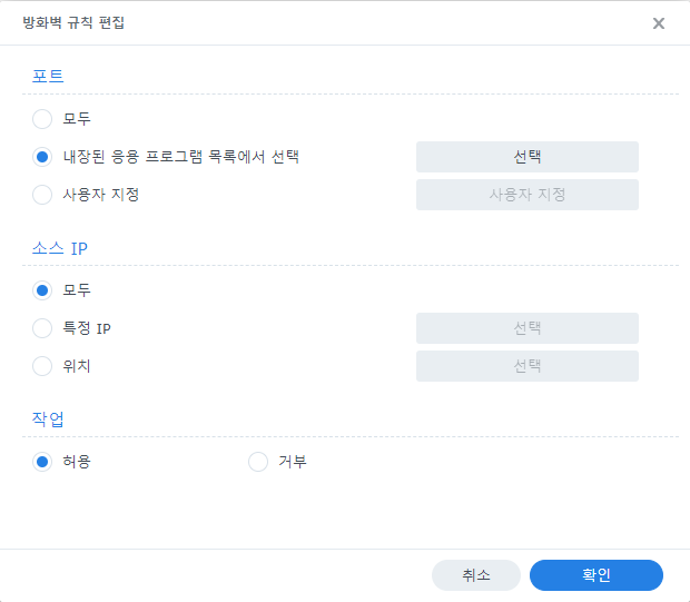 NAS 응용프로그램을 정상적으로 이용하려면 방화벽에서 허용 작업을 해야 합니다.