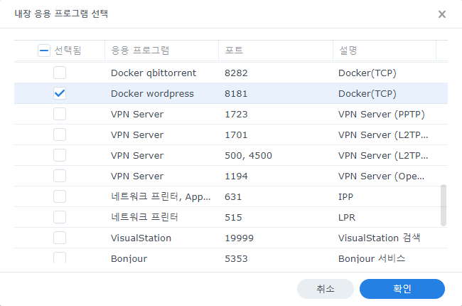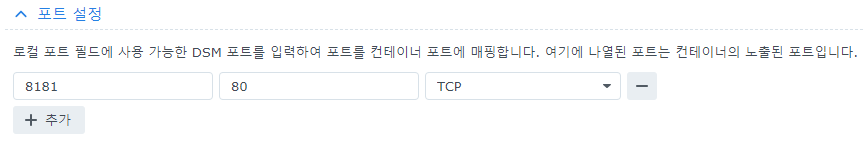 도커 컨테이너 설정에서 포트를 설정했기 때문에 위 목록에 나타납니다. 선택을 해야 외부에서 접근이 가능합니다.