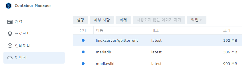 컨테이너 매니저의 이미지 화면에서 내려받은 이미지를 실행해서 설치를 시작합니다.