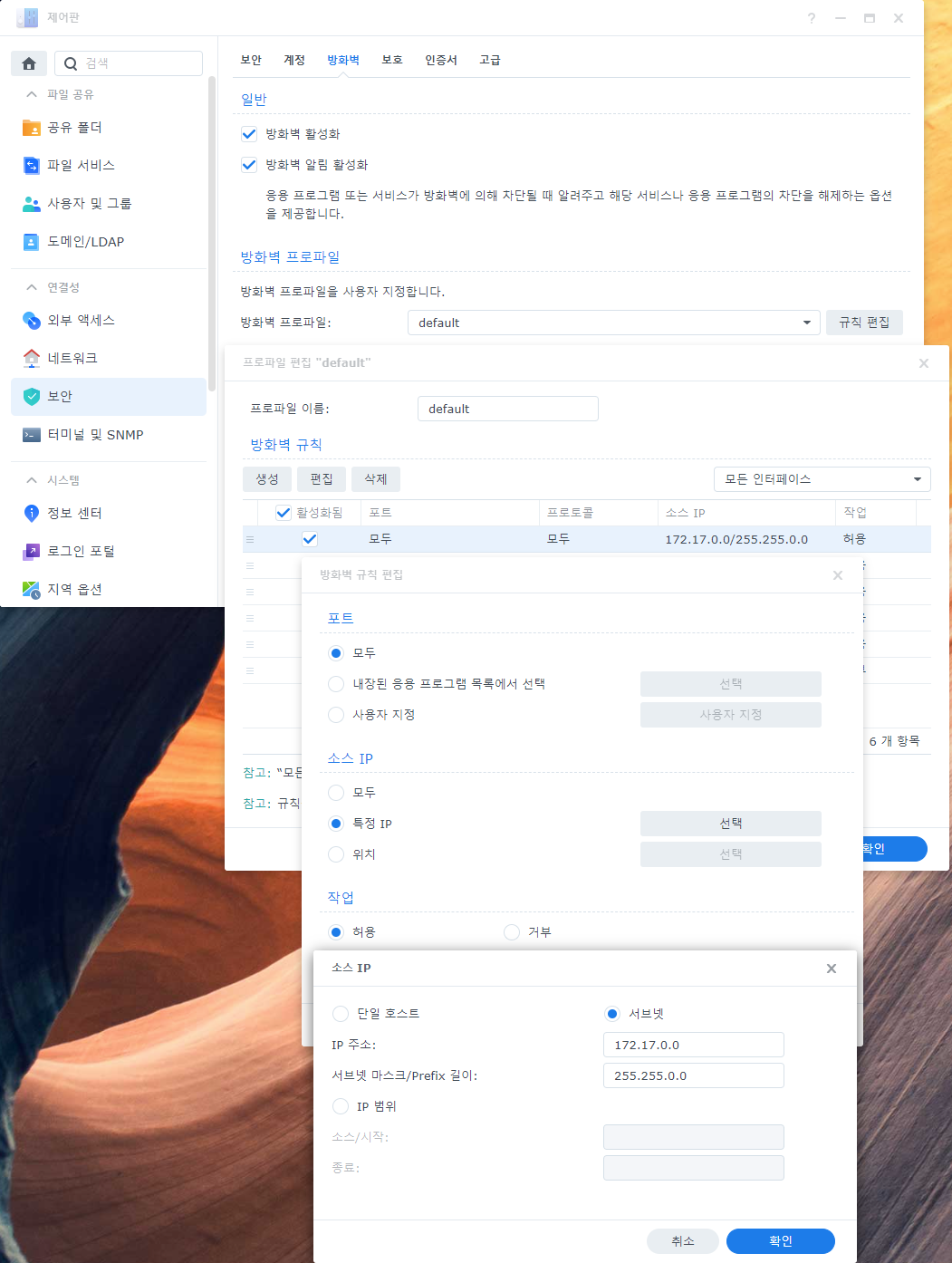 컨테이너 IP 대역을 방화벽에 추가합니다. 서브넷 마스크는 원하는 만큼 설정합니다.