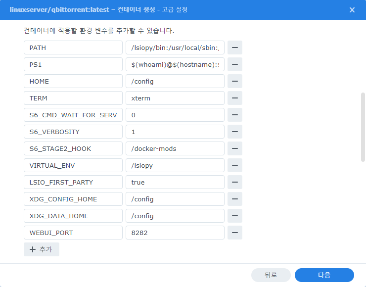 기본 WEB_UI 포트는 8080이며, 여기서는 8282로 변경해봅니다. NAS의 로컬 포터가 컨테이너에서 설정한 포트에 매핑됩니다.