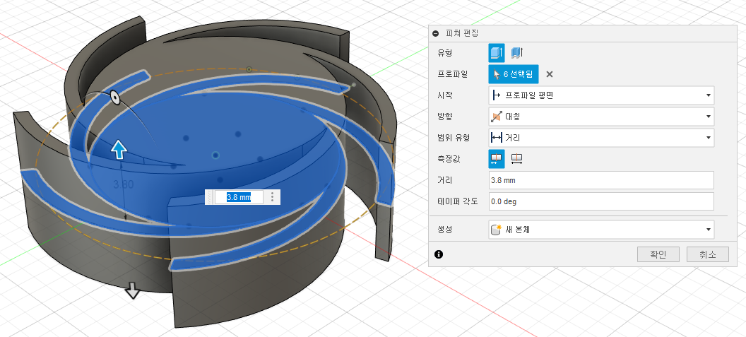 홈을 20개로 만듭니다. 톱니 스케치 하나를 그리고 원형 패턴을 적용하면 됩니다.