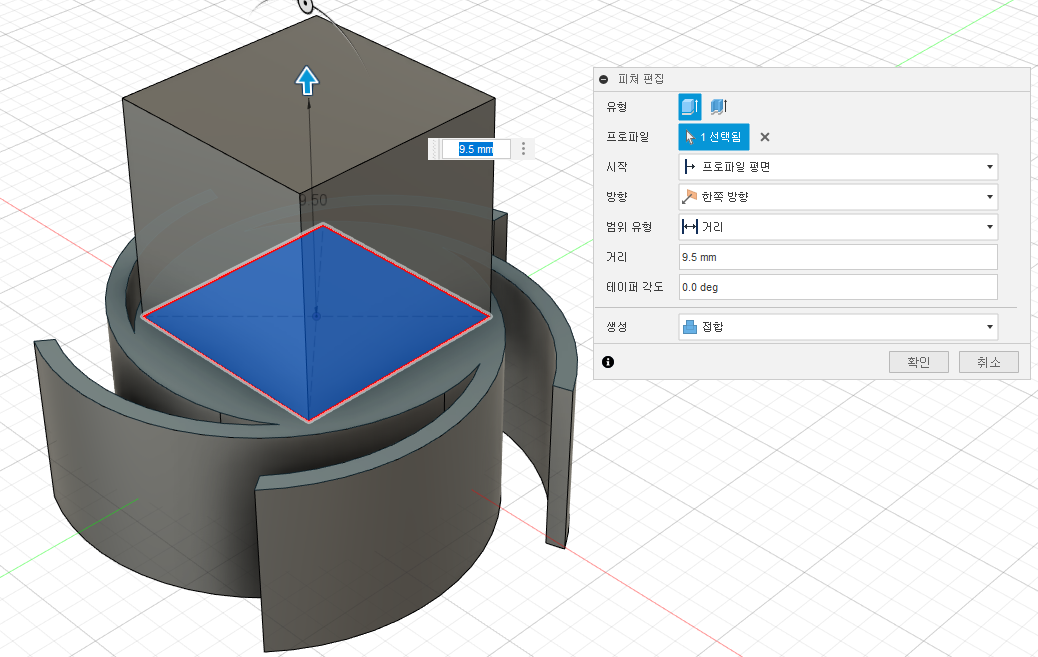 돌출 높이는 여유있게 뽑아줍니다. 위아래 커버 두께는 1mm, 래치 날개 두께는 7.6mm이므로 예제 처럼 9.5mm를 뽑으면 몸체 표면에서 8.1mm 튀어나옵니다.