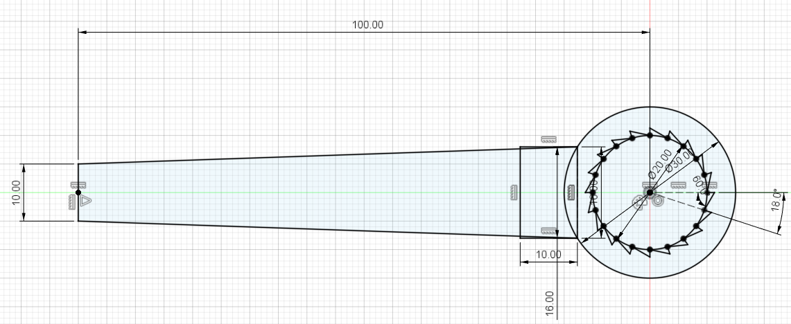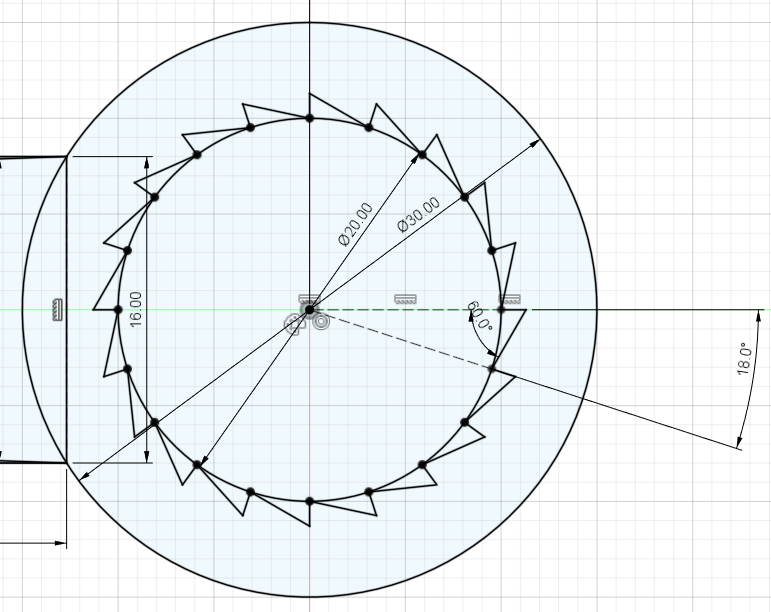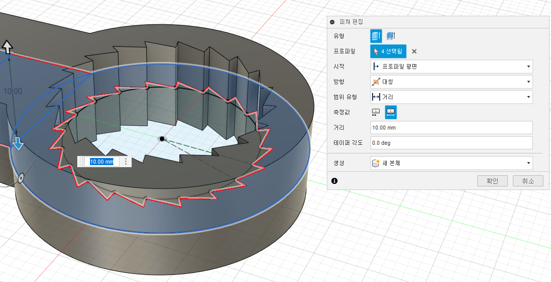 홈을 20개로 만듭니다. 톱니 스케치 하나를 그리고 원형 패턴을 적용하면 됩니다.