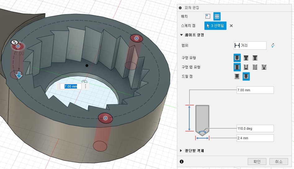 지름 14mm 구멍을 스케치하고, 뚫어버립니다.