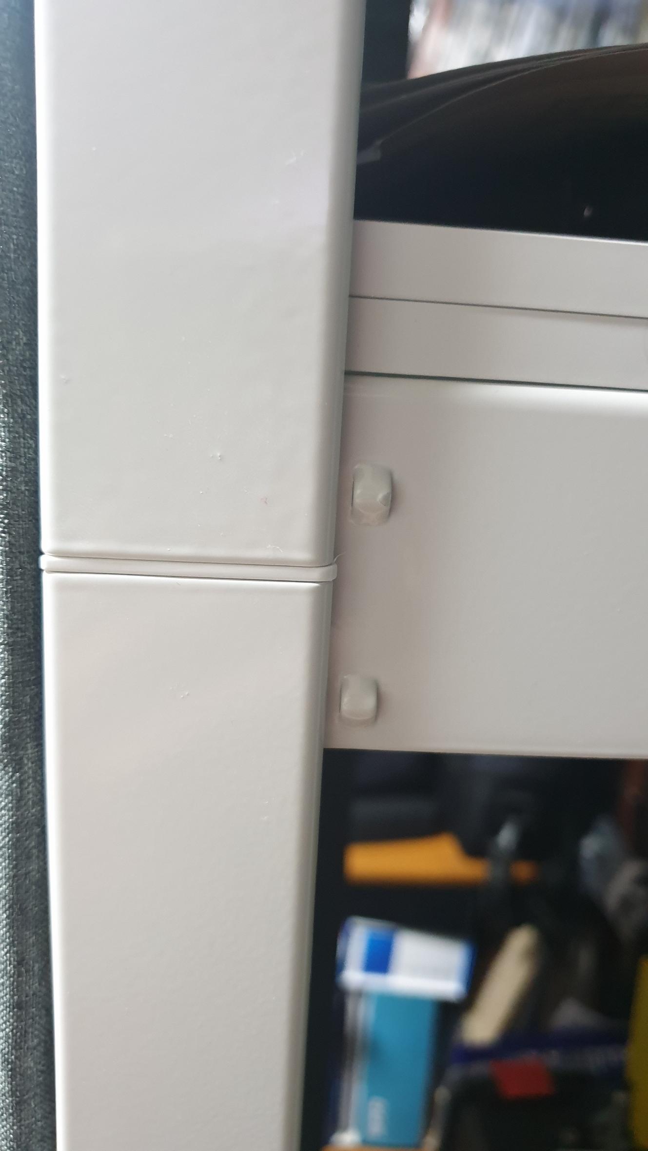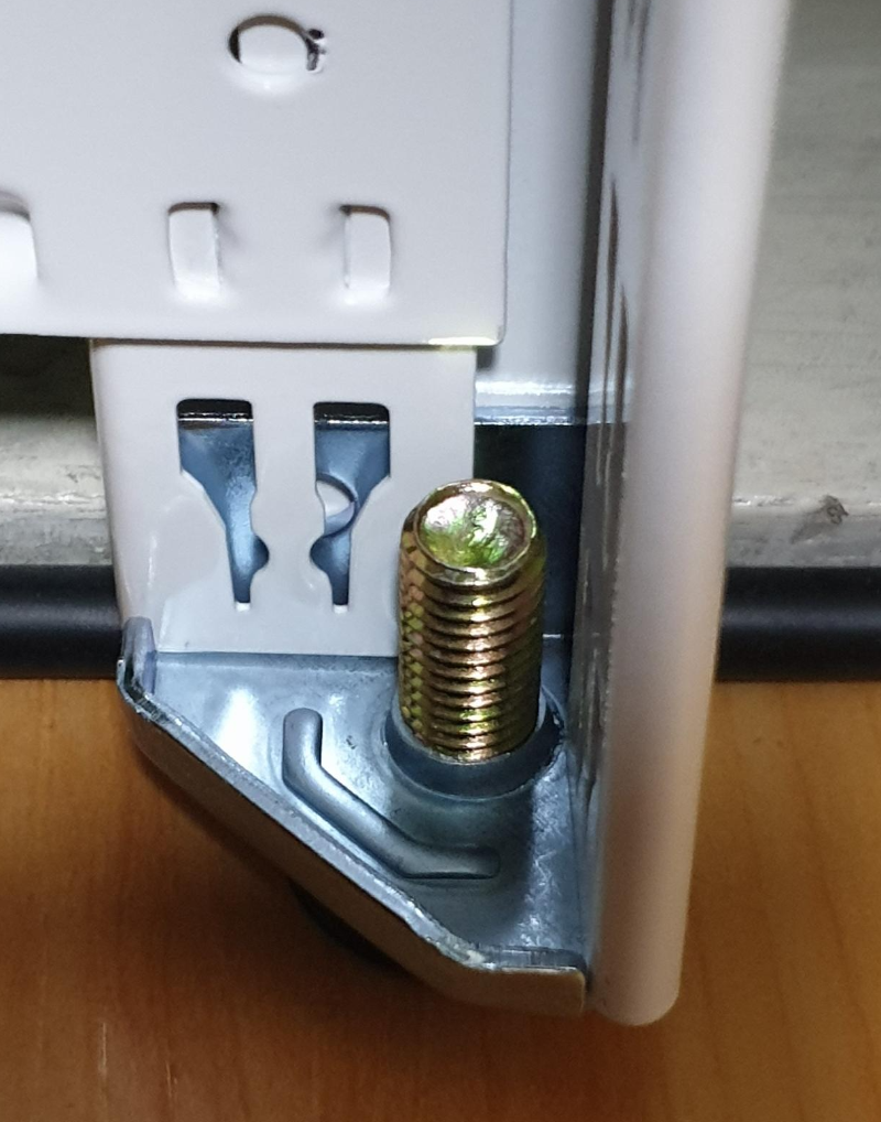홈던트하우스 선반 기둥의 절곡부분이 정확히 180도가 아니기 때문에, 절곡면 안쪽을 최대한 밀어서 끼워 넣어야 합니다. 기둥 연결 브라켓 근처에서는 플라스틱이 내부를 받치고 있기 때문에 받침 홀더 조립이 불가능 합니다. 그래서 기둥의 중간이나 끝 부분 처럼 절곡면이 움직이는 곳에서만 사용해야 합니다.