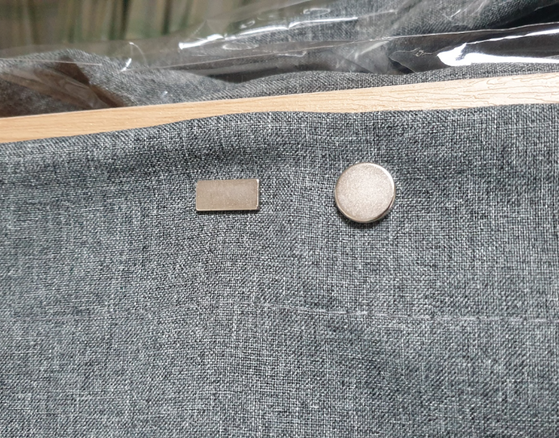 사진에서 보이는 사각 형태의 자석은 품질 관리되는 자석입니다. 커튼 부속품인 둥근 자석보다 크기도 작고, 두께도 얇습니다. 대신 자력이 더 강합니다. 가격이 저렴한 제품은 품질도 저렴합니다.