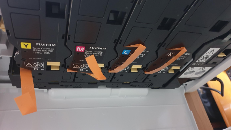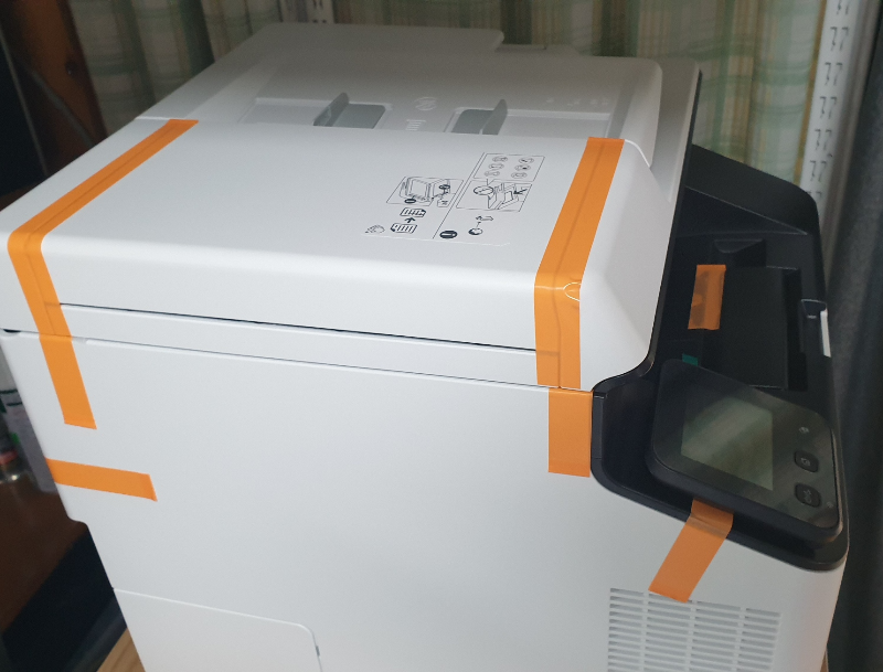 전면, 측면, 상면에 테이프가 붙어 있고, 우측의 토너 카트리지 출구 보호 테이프도 떼어내야 한다.