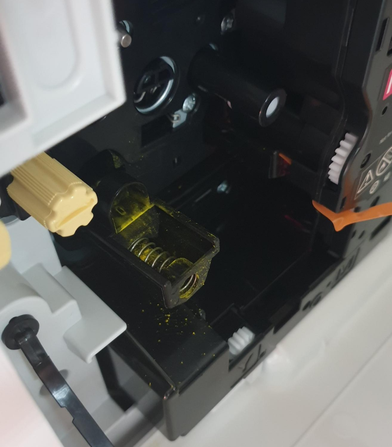 토너 카트리지를 빼기 전부터 노란색 가루가 흩어져 있었다. (포장 문제인지 이동중 충격인지 알 수 없음)