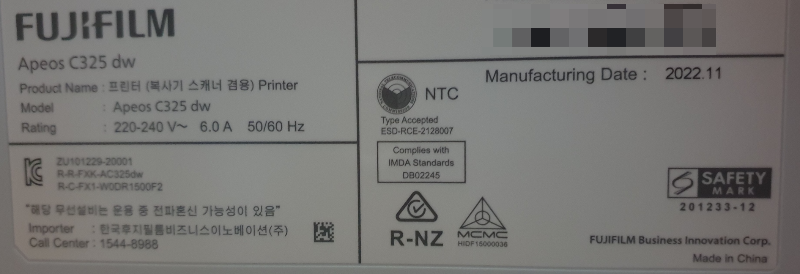 모델명은 Apeos C325dwx (x는 팩스가 없음을 뜻함)
