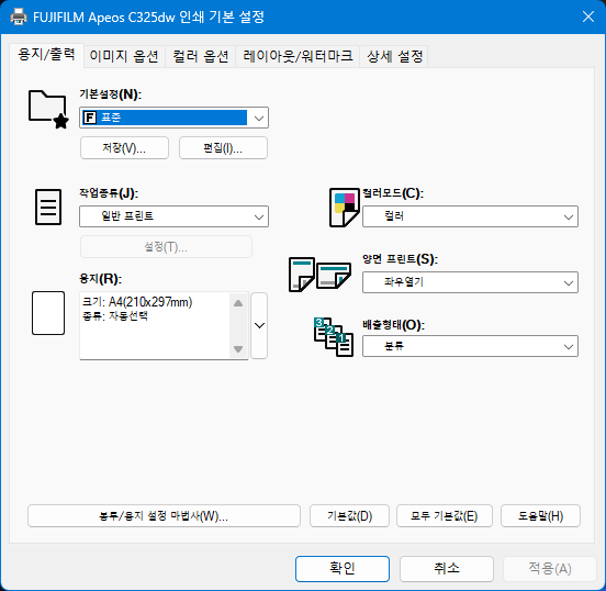 용지/출력에서는 두 가지만 조작하면 된다. 기본설정과 용지.
