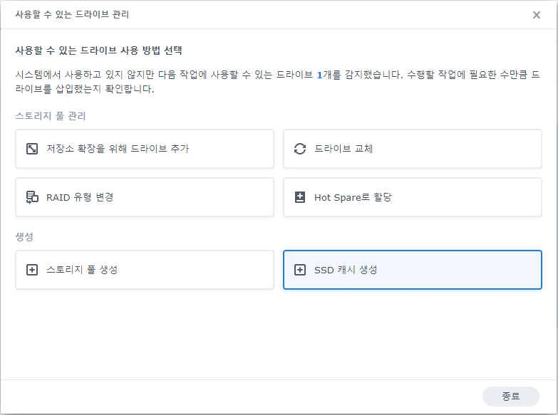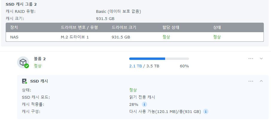 타사 SSD 제품에는 Synology SSD에 있는 전원 관련 기능 등이 빠져있기 때문에 읽기/쓰기 캐시를 선택 할 수 없습니다.