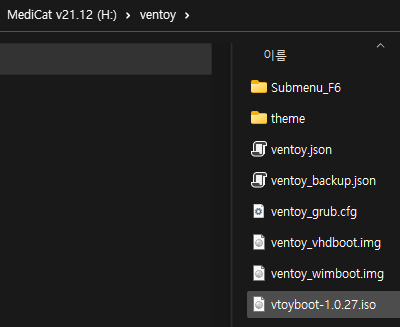아래 그림처럼 ventoy에 관련된 파일은 ventoy 폴더에 넣으면 된다.