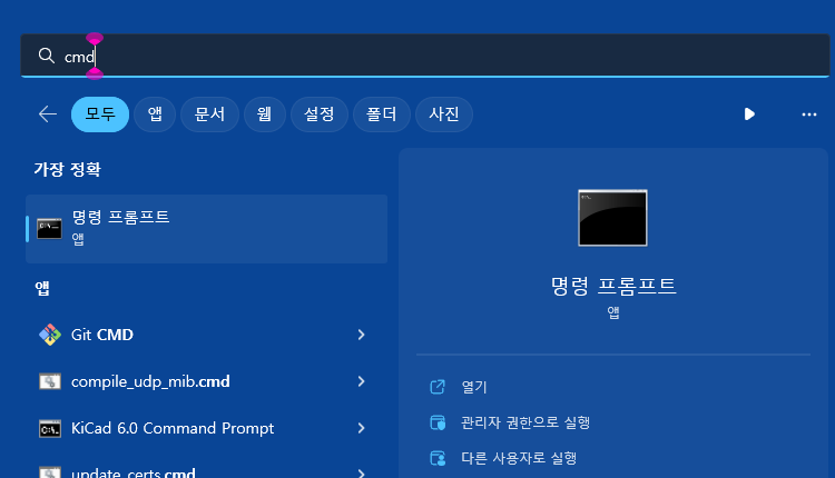 cmd를 입력하면 명령프롬프트가 실행된다.
