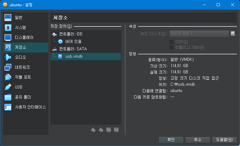 아무 컨트롤러에 위에서 만든 .vmdk 파일을 마운트한다.
